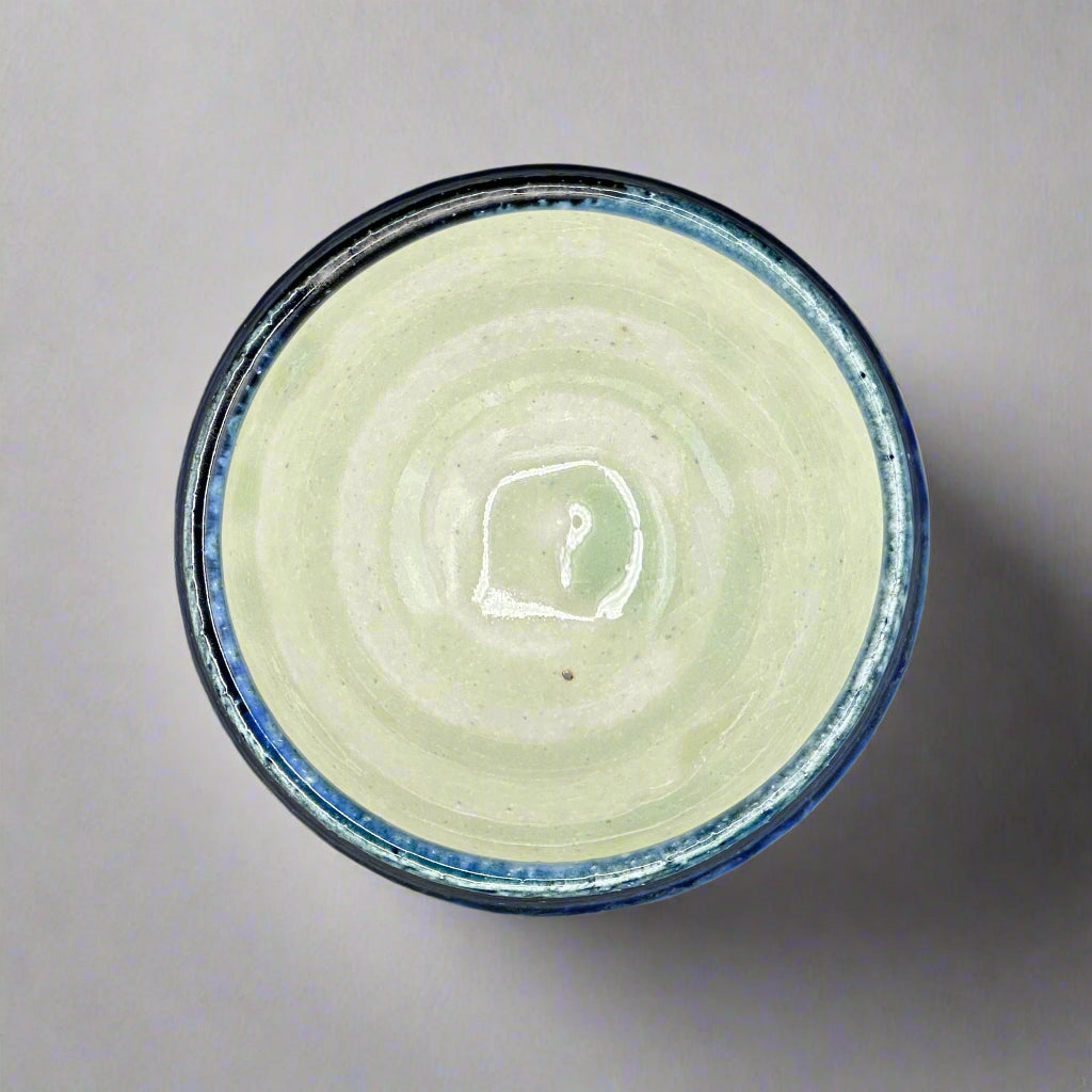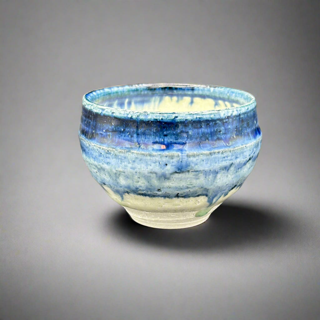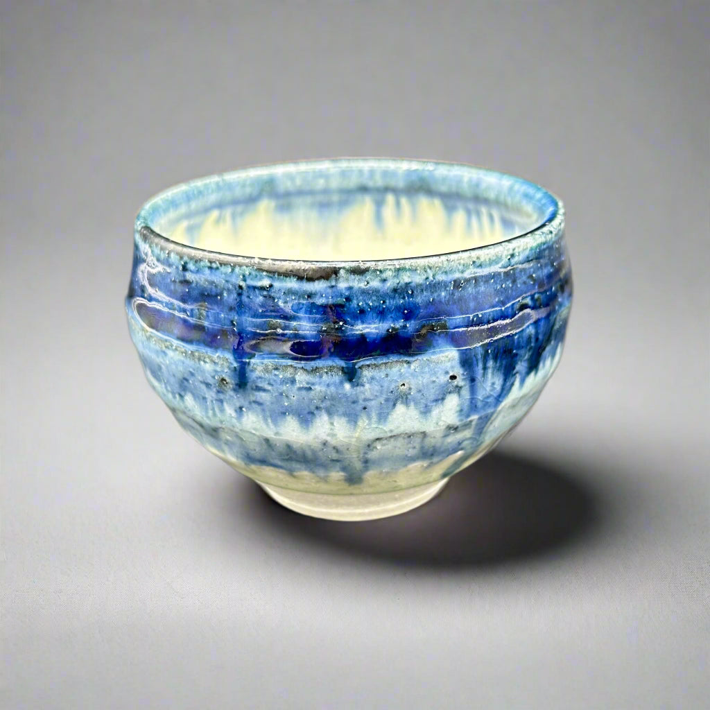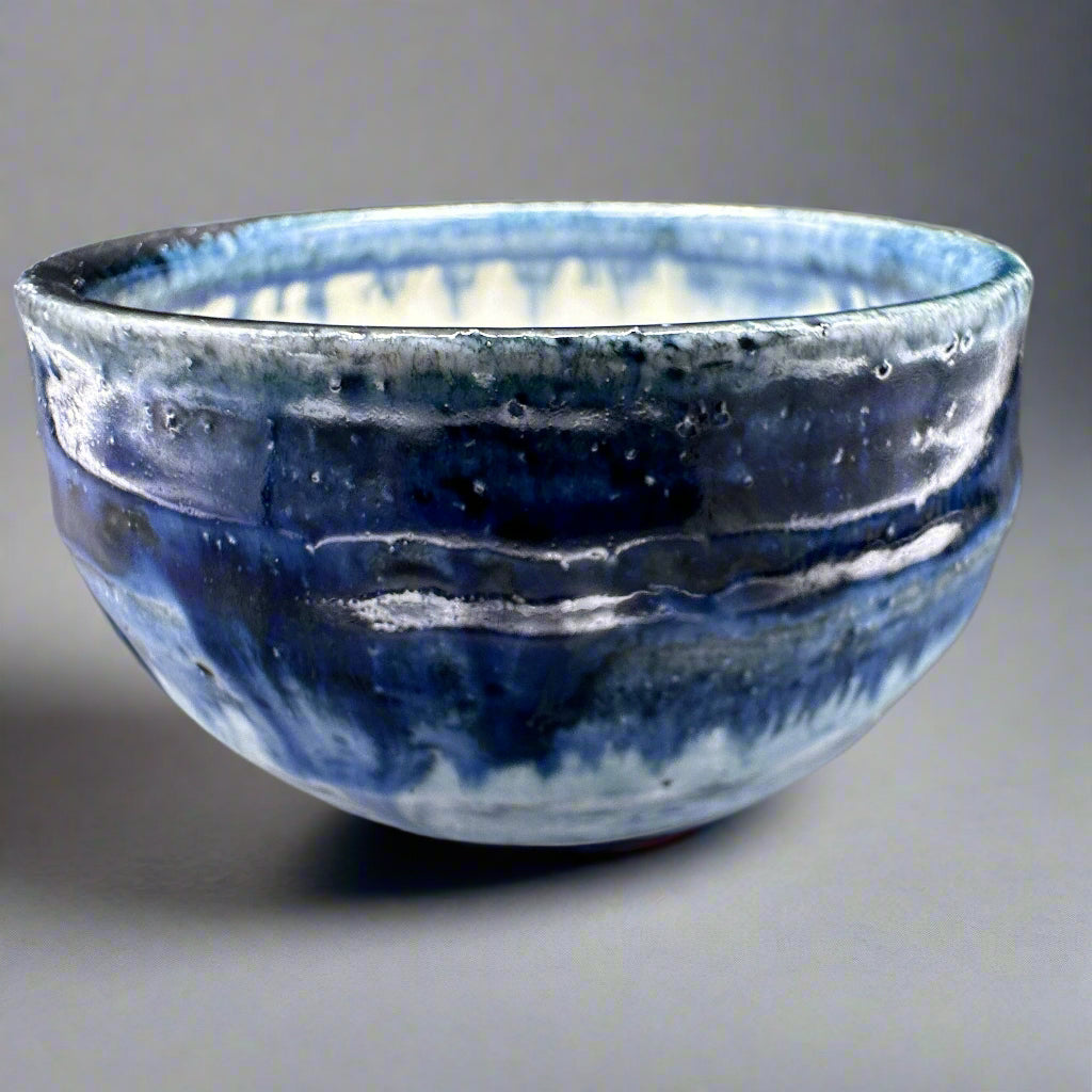 Swirls of indigo, cobalt, and midnight blue melt into pale ivory like the sky bleeding into seafoam. This hand-thrown chawan evokes the quiet drama of twilight, where color lingers and time slows.