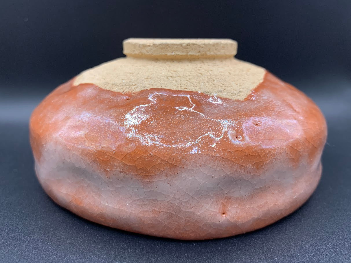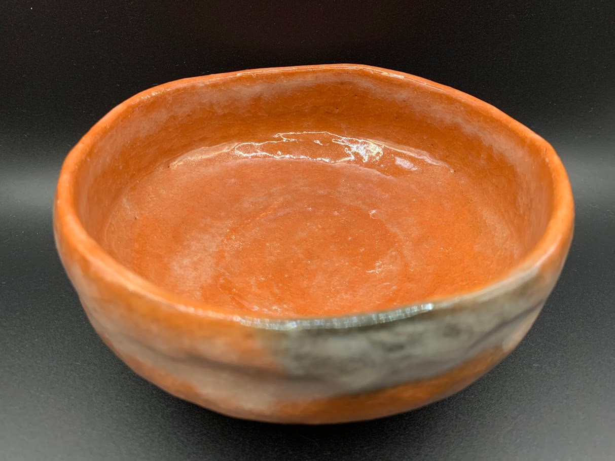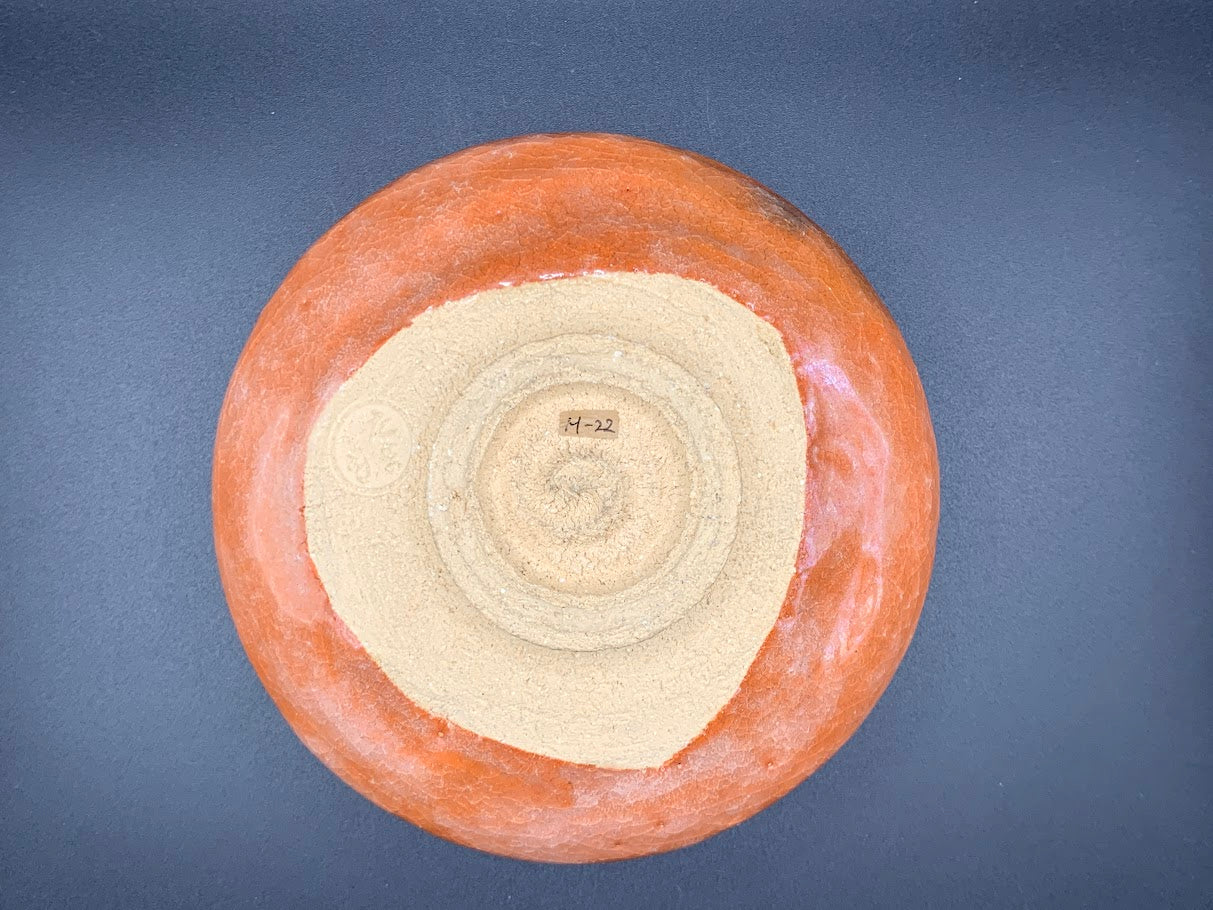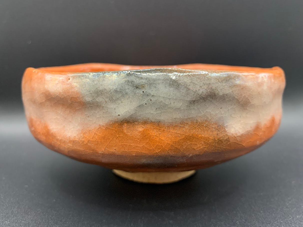 This chawan carries the fiery warmth of red clay with a soft gray glaze that drifts across its surface like passing clouds at dusk. Its bold contrast of earth and sky makes it a striking vessel for whisking matcha, grounding yet expansive, rustic yet refined.